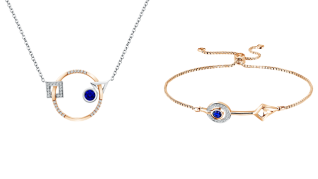 Koleksi ini terdiri dari necklace dan gelang bertatahkan berlian dan precious stone safir biru.