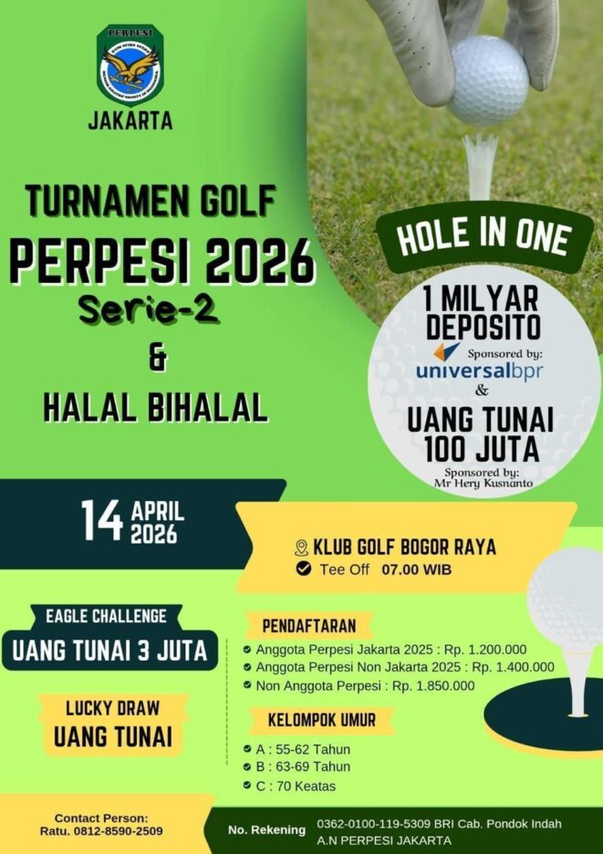 Semangat sportivitas dan kehangatan silaturahmi pasca-Lebaran siap menyatu di atas hijaunya fairway. Persatuan Senior Golf Indonesia (Perpesi) Jakarta akan segera menggelar ajang bergengsi Turnamen Golf Perpesi Jakarta Seri-2 yang dirangkaikan dengan tradisi Halal Bi Halal 1447 Hijriah.